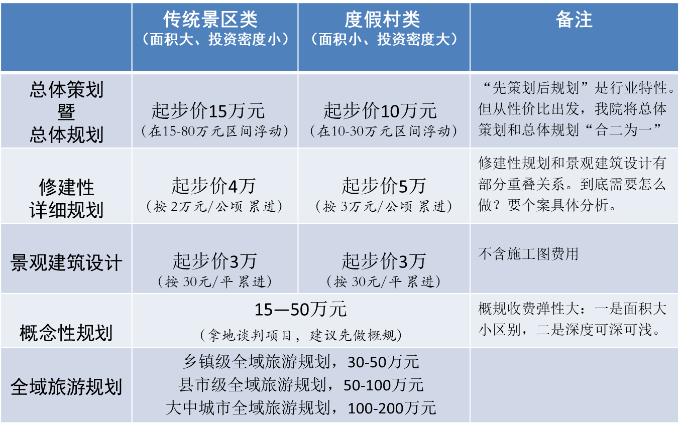 首先必須說明,旅游規(guī)劃收費(fèi)并無(wú)所謂的“標(biāo)準(zhǔn)價(jià)格”,但很多客戶還是表示希望“知根知底”,所以至道規(guī)劃院就結(jié)合多年經(jīng)驗(yàn)及行業(yè)...